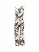This stylish floral print jumpsuit blends comfort with modern sophistication. Featuring soft pink blossoms on a crisp white backdrop, it offers a fresh, feminine appeal. The wide-leg cut flows gracefully, creating a flattering silhouette suitable for a variety of occasions—from relaxed get-togethers to polished daytime plans.